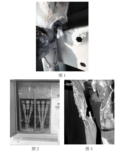 2008年3月24日,回南天,富灣站富油乙線速斷跳閘,位于戶外的一臺電纜分支箱產(chǎn)生短路爆破(如圖1),601開關(guān)出線電纜倉門嚴(yán)峻熏黑,打開后發(fā)現(xiàn)A相電纜終端應(yīng)力錐焚毀,纜芯熔損,開始分析主要為施工工藝粗糙,造成電纜終端電場畸變嚴(yán)峻,同時纜身緊靠固定用金屬支架,在箱內(nèi)潮濕環(huán)境下產(chǎn)成長時刻閃絡(luò)放電,最終絕緣破損接地短路,將出線套管炸壞,造成氣室漏氣,分支箱作廢。