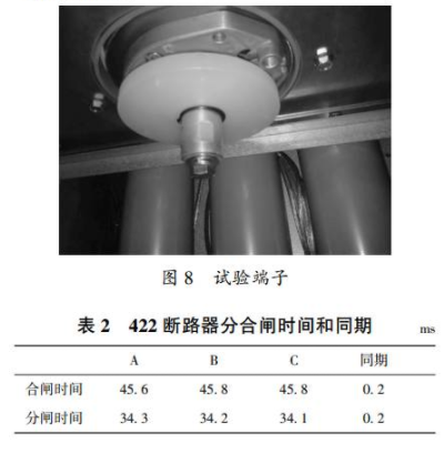 本次試驗選取422斷路器進行機械特性測試,按圖6進行試驗接線。將4221隔離開關置于接地位置,將試驗端子接到柜內電纜接口,然后將試驗線接到試驗端子下端進行試驗。試驗端子如圖8所示。422斷路器分合閘時間和同期見表2