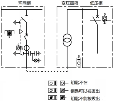 如圖7所示,環網箱內部,阻隔/接地開關與電纜室門之間的鑰匙聯鎖,電纜室蓋板翻開后,鑰匙被鎖定,不能拔出插入到阻隔開關鎖,即不能操作接地開關;只要蓋板合上,鑰匙才干拔出,去操作接地開關分閘。而體系角度,只要接地開關合閘,鑰匙才干被取出,去開變壓器箱的門,完結變壓器檢修,一起低壓斷路器不能合閘。