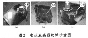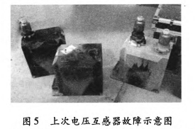 20113300:38,35kV垣潔線、35kV垣宏回AB相電壓互感器擊穿,如圖5所示;201232619:7:58,35kV垣潔線56號線路電壓互感器ABC相損壞,AB相有炸裂現象。