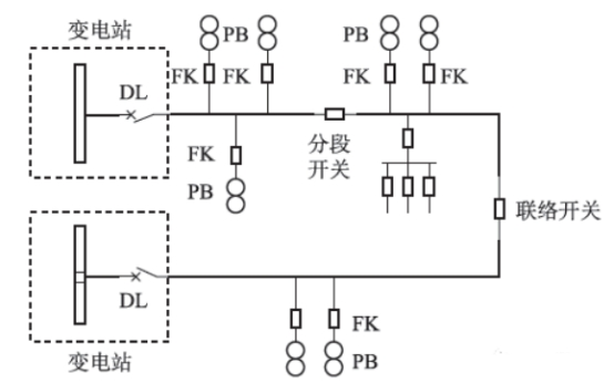 如下圖所示,其作為現(xiàn)階段典型的配電體系拓?fù)鋱D,變電站的10kV出線裝備斷路器和對應(yīng)維護(hù),主線路中引證開關(guān)分段,各分支線路結(jié)合負(fù)荷開關(guān)的方法進(jìn)行裝備,且全部開關(guān)都具有合閘等功能。由于分段開關(guān)與負(fù)荷開關(guān)在運(yùn)轉(zhuǎn)期間,難以斷開短路電流,所以不需求安裝維護(hù)設(shè)施。其間,圖中的DL歸于斷路器,FK歸于負(fù)荷開關(guān),而PB是配變。