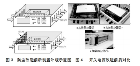 3.2在安裝本體進風孔加防塵網,避免灰塵進入安裝內部,設備維護人員定期對濾網停止打掃,從而減輕元器件外表覆塵,利于安裝正常散熱,如圖3所示加裝防塵網后開關電源表示圖。對安裝施行上述改良后,其改良前后比照如圖4所示。