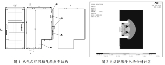 高壓帶電體對地最小空位處在支撐絕緣子上,通過核算支撐絕緣子的電場如圖2,滿足電場要求,究竟供認對地最小空位。依據(jù)最小空位原則供認氣箱外形規(guī)范(L1xW1xH1)。