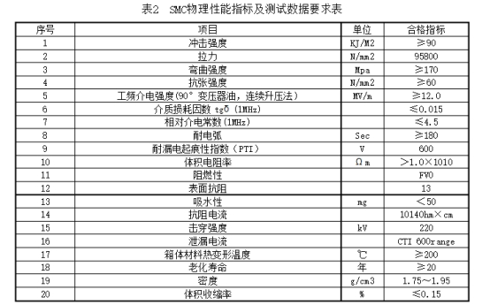 2.3.1分支箱外殼選用S304不銹鋼資料,箱體、門(mén)體資料厚度均不應(yīng)小于2毫米,或SMC復(fù)合資料箱體,SMC物理功用方針及測(cè)試數(shù)據(jù)滿足表2的要求。
