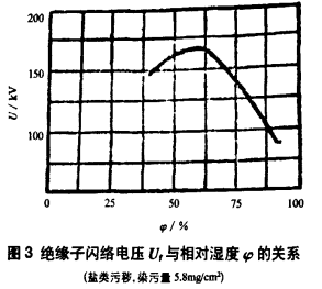 電纜分支箱地處交通要道,背靠山坡,面向公路,塵土很大,絕緣子表面的積塵較多,在污層受潮時。其中所含可溶性鹽類及酸堿成分溶解于水中,使表面電導率驟增,泄漏電流大量增加,大大降低閃絡電壓。一般說來,絕緣子的污閃電壓隨其污染程度的增加而降低。污染嚴重時,隨著污染程度持續增加,污閃電壓的下降已很緩慢,但這時污閃電壓常常已經低于工作電壓了。干燥污穢的電阻較大,它并不降低絕緣子的閃絡電壓,一般當空氣相對濕度小于50%~70%時,沿面閃絡電壓不會降低;高于這數值時,隨著濕度增加,閃絡電壓迅速下降,如圖3所示。實際運行中,絕緣子污閃事故都發生在霧、露、陰雨綿綿等高濕度的天氣.因為在這種條件下、積塵中水深性的鹽類溶解,使污層成為了半導體,大大增加泄漏,降低閃絡電壓。本次事故正值當地百年不遇的大雨期間,而開關柜柜體的密封較差,柜內相對濕度已達90%以上,開關柜的操作機構機構嚴重腐蝕,以至于完全不能正常操作,由臟污沿面放電的過程的討論可知,污層的電阻越大,泄漏電流越小,放電發展越困難,閃絡電壓也相應提高。在同樣污染和潮濕條件下,介質表面形狀、兩極間的沿面最短距離即泄漏距離是影響表面電阻和閃絡電壓的重要因素。泄漏距離增加,污閃電壓也增加。不同成都的污穢情況對線路及變電站絕緣的影響程度是不同的,因此應根據不同的污移情況,采取相應的絕緣標準保證電網安全運行"。目前, 我們用泄漏比距來估計臟污條件下絕緣子的耐污性能。由于我局所轄電網為渝中區,被定為三級污區,按變電站設備考慮泄瀾比距應大于4cm/MkV。