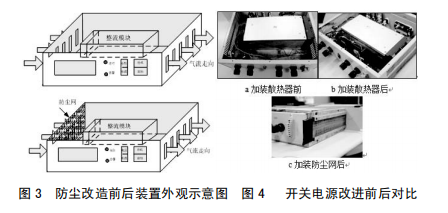 (2)在裝置本體進風孔加防塵網,防止灰塵進入裝置內部,設備維護人員定期對濾網進行清掃,從而減輕元器件表面覆塵,利于裝置正常散熱,如圖3所示加裝防塵網后開關電源示意圖。對裝置實施上述改進后,其改進前后對比如圖4所示。